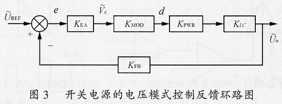 KFB=UREF/Uo,為反饋系數(shù);誤差e為輸出采樣值偏離穩(wěn)態(tài)點(diǎn)的波動(dòng)值,經(jīng)電壓誤差放大器KEA放大后,得;KMOD為脈沖寬度調(diào)制器增益,KMOD=d/=1/Vs;KPWR為主電路增益,KPWR=/d=Uin;KLC為輸出濾波器傳遞函數(shù),KLC=(1 sCRe)/[S2LC s(ReC L/Ro) 1]。