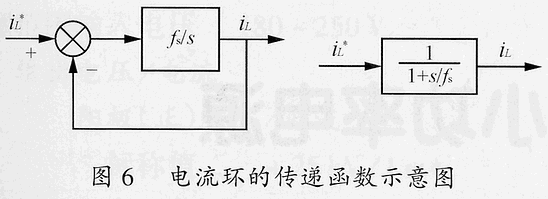 將s=2πfc代入上式,并令上式等于1時(shí),可得環(huán)路的剪切頻率fc=fs/(2π)。因此,可將電流環(huán)等效為延時(shí)時(shí)間常數(shù)為一個(gè)開關(guān)周期的純慣性環(huán)節(jié),如圖6所示。顯然,當(dāng)電流誤差放大器的增益GCA小于最優(yōu)值時(shí),電流響應(yīng)的延時(shí)將會(huì)更長。
