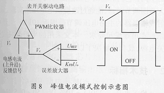 平均CMC由于要采樣濾波電感的電流,有時(shí)顯得不太方便,因此,實(shí)踐中經(jīng)常采用一種變通的電流模式控制方法,即峰值CMC,如圖8所示。電壓外環(huán)輸出控制量(Vc)和由電感電流上升沿形成的斜坡波形(Vs)通過電壓比較器進(jìn)行比較后,直接得到開關(guān)管的關(guān)斷信號(hào)(開通信號(hào)由時(shí)鐘自動(dòng)給出),因此,電壓環(huán)的輸出控制量是電感電流的峰值給定量,由電感電流峰值控制占空比。