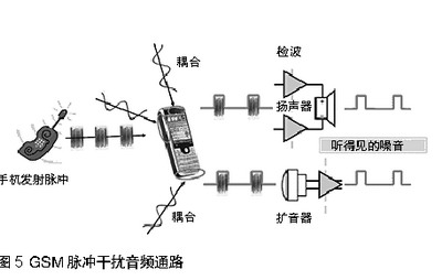 當手機與基站通訊,或兩個手機彼此接近時,發射脈沖通過擴音器,揚聲器,或頭戴式耳機線傳人音頻通路。見圖5。