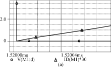 由圖4可知,當開關導通時,開關電壓V(M1:d)(Vds)下降,由于電感Lr的作用,電流不能突變,使得開關電流is在開關電壓V(M1:d)(Vds)降到零后,才從零開始上升,實現了開關的零電流導通。當開關關斷時,由于電容Cs的鉗壓作用,開關電壓從低電壓上升,基本實現零電壓關斷。而電感電流iLr和電壓vcr波形與理論分析的是一致的。