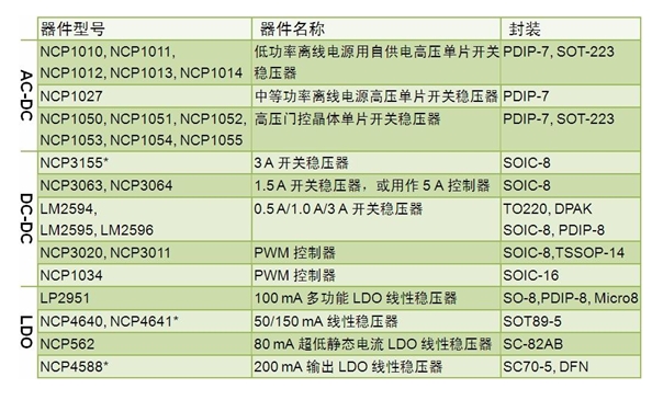關(guān)穩(wěn)壓器 NCP3155、1.5 A 開(kāi)關(guān)穩(wěn)壓器 NCP3063/4、0.5/1.0/3 A 開(kāi)關(guān)穩(wěn)壓器 LM2594/5/6、NCP3020/11 脈寬調(diào)制(PWM)控制器及 NCP1034 PWM 控制器。