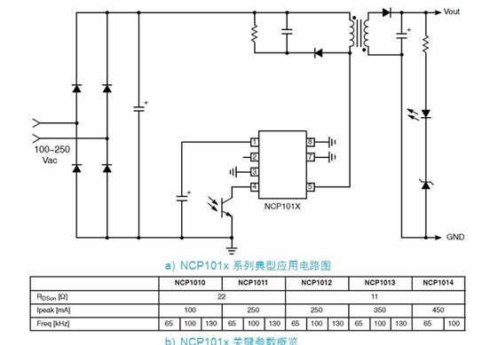 以 NCP101x 為例,這系列器件集成了固定頻率電流模式控制器及典型導(dǎo)通阻抗為 11 或 22 ? 的 700 V MOSFET,提供構(gòu)建強(qiáng)固及低成本開(kāi)關(guān)電源所需的全部特性,包括軟啟動(dòng)、頻率抖動(dòng)、短路保護(hù)、跳周期、最大峰值電流設(shè)定點(diǎn)及動(dòng)態(tài)自供電(不需要輔助繞 組)等。在正常負(fù)載工作期間,NCP101x 以 65、100 及 130 kHz 中的某一頻率開(kāi)關(guān);而當(dāng)電流設(shè)定點(diǎn)降到低于某個(gè)給定值(如輸出功率需求消失)時(shí),NCP101x 自動(dòng)進(jìn)入所謂的跳周期模式(在此模式下跳除不需要的開(kāi)關(guān)周期),從而提供極佳的輕載能效。由于進(jìn)入跳周期模式通常發(fā)生在最大峰值電流的 1/4 時(shí),故沒(méi)有可聽(tīng)噪聲產(chǎn)生。因此,待機(jī)能耗降至最低,且沒(méi)有可聽(tīng)噪聲產(chǎn)生。NCP101x 典型應(yīng)用電路及不同型號(hào)的關(guān)鍵參數(shù)參見(jiàn)圖 2。