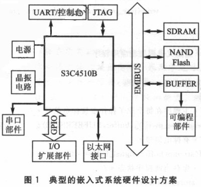 圖1是一種典型的嵌入式系統硬件設計方案。系統的微處理器采用S3c4510B,是基于ARM7體系結構的。SDRAM是一種易失性存儲器作為程序的運行空間,類似于PC機的內存;Flash作為程序存儲空間是非易失性的。程序運行過程中的數據往往緩存在sDRAM中,在系統失電時必須寫往Flash。