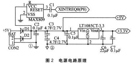 這個電源回路除了可以提供5v和3.3v的電源以外,還為系統掉電保護提供了延時及預警功能,通過軟件的配合可以實現系統的掉電保護機制。正常情況下,由供電回路1給整個系統供電。當系統由于意外原因掉電時,由于輸入的比較電壓降低,這樣MAX809 模塊輸出電壓產生翻轉為系統提供掉電中斷預警信號,中斷請求通過外部中斷引腳XREQ0產生;同時供電回路2開始啟用。通過大電容C3、c4放電,繼續為系統提供一段供電電壓,支持掉電中斷服務程序完成。供電回路2只給最小系統供電,并不給耗電量大的外圍部件供電。這樣,給最小系統的供電時間足夠長,可以完成敏感數據的保護操作。