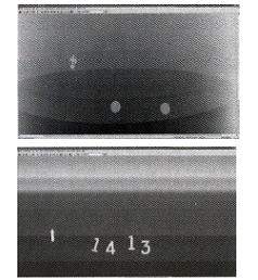 在進(jìn)行圖像尺寸測量時,需要將經(jīng)過計(jì)量或已知精確尺寸的試件緊貼在被檢焊縫的一側(cè)與焊縫同時成像。每次評定前,應(yīng)作一次標(biāo)定,缺陷測量時進(jìn)行對比或通過公式將圖像尺寸轉(zhuǎn)化為真實(shí)尺寸。為此,設(shè)計(jì)了專用的測量評片用試片(圖3),試片也可用于檢測相對運(yùn)動速度是否匹配。