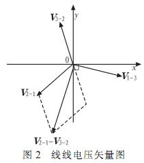 三路線線電壓在空間上的矢量圖如圖2所示。由圖2可知,三路線線電壓中任意兩路之差與第三路呈正交關系,若能提取出這樣的兩路正交信號,就能很好地解決芯片的輸入問題。對此作出如下推導: