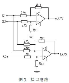 由于RD-19230芯片內(nèi)部處理信號為兩路正交信號,通常情況下可由旋轉(zhuǎn)變壓器直接提供,其正常工作情況下對兩路輸入信號電壓要求為2Vrms±15%,而自整角機輸出信號為三線壓值不定的信號,從而設計出簡單方便的轉(zhuǎn)換電路是有必要的。