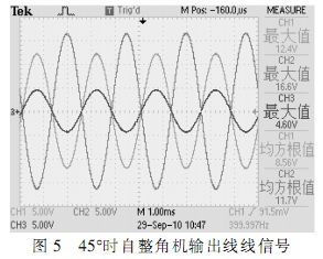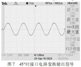 根據(jù)圖中所示,在確定的角度下,自整角機三路線線信號在電壓上呈120°正弦關系,接口電路轉(zhuǎn)換輸出信號為兩路電壓正交信號,根據(jù)角度不同,兩路信號電壓峰值不同,單路最大時電壓為2Vrms。測試結(jié)果完全符合設計要求。