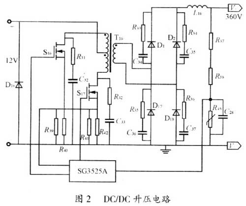 其工作原理為將升壓變壓器的中心抽頭接于正電源,兩路相反的PWM驅(qū)動脈沖送至開關管S16、S17的基極,從而控制兩只功率管交替工作,得到的方波交流電壓經(jīng)變壓器輸出,經(jīng)電感L16和電容濾波得到360V直流。電流檢測電阻(R41//R42)得到的電壓接到SG3525A的腳10來實現(xiàn)過流保護。R37、R38和R45為電壓采樣,構成電壓負反饋,因而提高了電路的可靠性。SG3525A及控制電路的電源都來自蓄電池,D16為防反接二極管。DC/DC從12V蓄電池電壓升到360V直流電,供后級鎮(zhèn)流電路點燈。