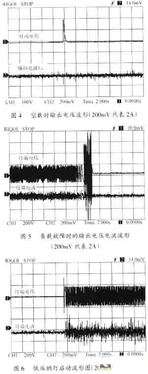 圖7為低壓鈉燈正常工作電壓、電流波形圖,圖7通道l為其正常工作電壓波形圖,電壓有效值為105V,通道2為其正常工作電流波形圖,電流有效值為O.50A,最大值為0.7A,功率為53W。