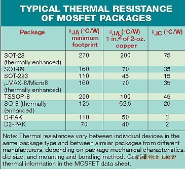 例如,采用1平方英寸的銅片,D-Pak的ΘJAD-Pak可能是50°C/W。但如果銅片就設(shè)在封裝引腳下,ΘJA值將會加倍(參見表)。采用多個并聯(lián)MOSFET,ΘJA主要依賴于它所安裝的銅片面積。兩個元器件的等效ΘJA可能是只有一個元器件時的一半,除非銅片的面積加倍。就是說,增加并聯(lián)MOSFET而不同時增加銅片面積,將使RDS(ON)減半,但對ΘJA的改變小得多。