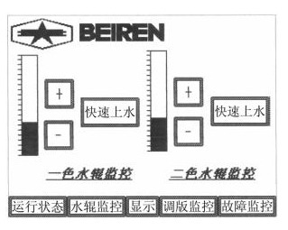 在人機界面中,設計了7幅畫面,包括整體圖形,故障顯示,機器速度和計數顯示,水輥速度顯示,調版監控等。故障顯示使用指示器,給出位元件即可實現閃動效果,讓操作者很方便的知道故障部位,整體感很好。在水輥速度顯示中,設計了一個柱狀圖,可以顯示水量增加大小,只需按下柱狀圖,就可增加水量,同時也可方便監控。如圖所示: