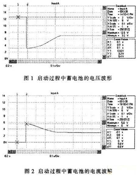 超級(jí)電容器與蓄電池并聯(lián)時(shí),汽車啟動(dòng)過程的電壓波形如圖4所示,電流波形如圖5所示。與圖1和圖2相比,啟動(dòng)瞬間電壓跌落由只采用蓄電池時(shí)的3.2V提升到7.2V;啟動(dòng)電流從560A提高到l200A;啟動(dòng)瞬時(shí)的電源輸出功率從2kW上升到8.7kW;啟動(dòng)過程的平穩(wěn)電壓由7V提高到9.4V;啟動(dòng)過程的平穩(wěn)電流由280A提高到440A;啟動(dòng)過程的電源平穩(wěn)輸出功率從2.44kW提高到4.12kW。