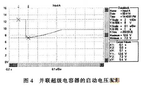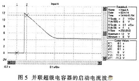蓄電池是汽車中的關(guān)鍵電器部件,其性能直接影響汽車的啟動(dòng)。現(xiàn)在的汽車啟動(dòng)無一例外地采用啟動(dòng)電動(dòng)機(jī)啟動(dòng)方式。在啟動(dòng)過程中特別是在啟動(dòng)瞬間,由于啟動(dòng)電動(dòng)機(jī)轉(zhuǎn)速為零,不產(chǎn)生感生電勢(shì),故啟動(dòng)電流:I=E/(RM+RS+RL);其中:E為蓄電池空載端電壓,RM為啟動(dòng)電動(dòng)機(jī)的電樞電阻,RS為蓄電池內(nèi)阻、RL為線路電阻。由于RM、RB、RL均非常低,啟動(dòng)電流非常大。例如用12V、45Ah的蓄電池啟動(dòng)安裝1.9L柴油機(jī)的汽車,蓄電池的電壓在啟動(dòng)瞬間由12.6V降到約3.6V,啟動(dòng)過程的蓄電池電壓波形如圖1所示。啟動(dòng)瞬時(shí)的電流達(dá)550A,約為蓄電池的12C的放電率>啟動(dòng)過程的蓄電池電流波形如圖2所示。電流傳感器的電流/電壓變換比率為100A/V。盡管車用蓄電池是啟動(dòng)專用蓄電池,可以高倍率放電,但從圖l可以看出,10倍以上高倍率放電時(shí)的蓄電池性能變得很差,而且,如此高倍率放電對(duì)蓄電池的損傷也是非常明顯的。啟動(dòng)過程的電壓劇烈變化也是極強(qiáng)的電磁干擾,可以造成電氣設(shè)備掉電,迫使電氣設(shè)備在發(fā)電機(jī)啟動(dòng)過程結(jié)束后重新上電,計(jì)算機(jī)在這個(gè)過程中非常容易死機(jī)。因此,從改善汽車電氣設(shè)備的電磁環(huán)境、改善汽車的啟動(dòng)性能和蓄電池性能或延長(zhǎng)蓄電池使用壽命來考慮,改善汽車電源在啟動(dòng)過程中的性能是必要的。解決問題的方案之一是加大蓄電池的容量,但需要增加很多,并使其體積增大,這并不是好的選擇。而將超級(jí)電容器與蓄電池并聯(lián)可以很好地解決這個(gè)問題。