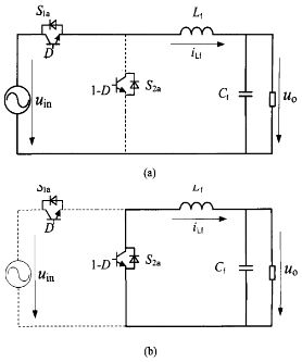 當(dāng)開關(guān)管S1a開通、S2a關(guān)斷時(shí),輸入電壓通過開關(guān)管S1a的反向二極管、電感Lf給電容Cf和負(fù)載供電,如圖3(a)所示;當(dāng)開關(guān)管S1a斷開,S2a開通時(shí),電感電流iLf經(jīng)Lf、開關(guān)管S2a、Cf和負(fù)載續(xù)流,Lf和Cf共同向負(fù)載供電,如圖3(b)所示。