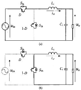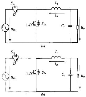 當(dāng)開關(guān)管S1b開通、S2b關(guān)斷時(shí),輸入電壓通過開關(guān)管S1b的反向二極管、電感Lf給電容Cf和負(fù)載供電,如圖5(a)所示;當(dāng)開關(guān)管S1b斷開,S2b開通時(shí),電感電流iLf經(jīng)Lf、Cf和負(fù)載、開關(guān)管S2b續(xù)流,Lf和Cf共同向負(fù)載供電,如圖5(b)所示。