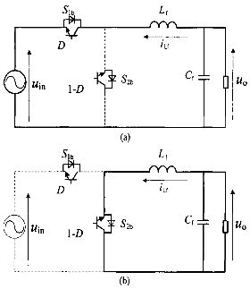 當(dāng)開關(guān)管S1b開通、S2b關(guān)斷時(shí),輸入電壓通過開關(guān)管S1b、電感Lf給電容Cf和負(fù)載供電,如圖4(a)所示;當(dāng)開關(guān)管S1b斷開,S2b開通時(shí),電感電流iLf經(jīng)Lf、開關(guān)管S2b的反向二極管、Cf和負(fù)載續(xù)流,Lf和Cf共同向負(fù)載供電,如圖4(b)所示。