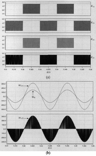 開關(guān)管S1a、S1b、S2a、S2b的控制信號K1a、K1b、K2a、K2b的仿真波形如圖7(a)所示。當(dāng)輸入電壓大于零時(shí),開關(guān)管S1b、S2b恒通,S1a、S2a高頻互補(bǔ)開通;當(dāng)輸入電壓小于零時(shí),開關(guān)管S1a、S2a恒通,S1b、S2b高頻互補(bǔ)開通。圖7(b)為輸入電壓uin、輸出電壓uo和交流開關(guān)管S2的兩端(即S2a、S2b兩管D(漏極)-D(漏極)之間的)電壓波形uS2。