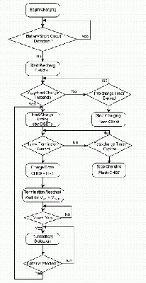 圖6所示為鋰離子電池充電器的標準充電流程,首先充電IC偵測是否有輸出短路或是過載的保護模式,若系統一切正常接著偵測電池初始電壓是否達到 3V以上,高于3V者就直接以快充模式進行高電流充電,若電池低于3V者,進入預充電模式,以快充的10%進行充電,喚醒電池并避免電池損壞。在預充電階段,仍隨時偵測電池電壓,達到3V后可隨即切入快充模式。