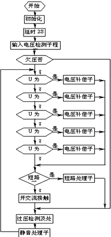 系統接通市電,合上電源開關后,單片機進行初始化,延時2秒后,進行輸入電壓檢測,若輸入電壓在允許范圍內,則根據電壓值進行相應的電壓補償,否則補償電路不進行任何動作,但要相應的聲光告警;電壓調整完畢達到輸出標準后,自動合上輸出交流接觸器,系統正常輸出。此時,單片機對輸出電壓進行過壓檢測,一旦輸出電壓過高,則切斷輸出,以防輸出電壓過高而影響負載工作,在電壓恢復正常后,自動合閘,輸出電壓。單片機還對輸入電壓進行實時檢測,只要市電發生變化,就進入相應的電壓補償子程序,對補償電壓進行調整。其流程圖見圖5。