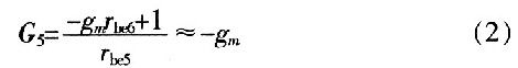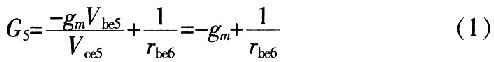 式中,gmVbe5前面加負(fù)號(hào)的原因?yàn)椋捍穗娏髟丛龃髸r(shí)Vce5是減少的。化簡(jiǎn)式(1)可得: