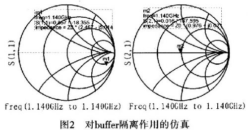 圖2是對(duì)buffer隔離作用的仿真。通過仿真發(fā)現(xiàn):壓控振蕩器與外部電路相接時(shí),外部電路阻抗的變化不會(huì)對(duì)壓控振蕩器的阻抗產(chǎn)生影響。