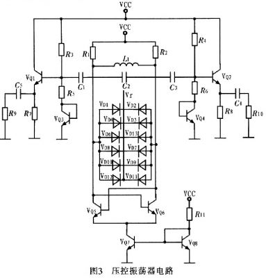 壓控振蕩器按構(gòu)成原理可分為反饋型振蕩器和負(fù)阻型振蕩器2大類。這里采用負(fù)阻型振蕩器,其主要是由負(fù)阻器件和諧振回路組成的振蕩器,利用負(fù)阻器件的負(fù)電阻效應(yīng)與諧振回路中的損耗正電阻相抵消,維持諧振回路的穩(wěn)定振蕩。圖3為壓控振蕩器電路。