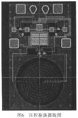利用安捷倫公司的ADS軟件對(duì)電路進(jìn)行仿真,從圖5可看出壓控振蕩器在控制電壓為1.98~3.98 V變化時(shí),振蕩器調(diào)諧范圍為1.14~1.18GHz。圖6為壓控振蕩器電路版圖。
