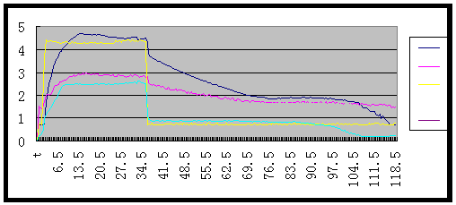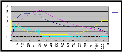 注:深藍—輸入軸轉速,黃—節氣門開度,紫紅—發動機轉速,淺藍—電磁離合器電流