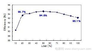 轉(zhuǎn)換器的效率如圖 7 所示,在額定負(fù)載為 20%、50% 和 100% 的情況下測得的效率分別為93.7%、94.6% 和 93.1%,這顯示了邊際性能,因而使用設(shè)計(jì)優(yōu)良的 PFC 和 DC-DC 級(jí)能夠達(dá)到85 PLUS 規(guī)范要求。