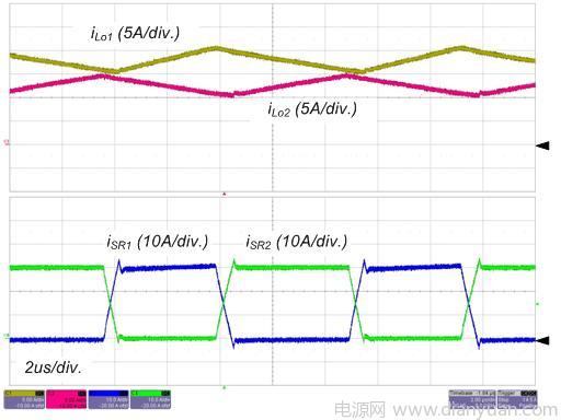 圖 4 和圖 5 所示為轉(zhuǎn)換器在標(biāo)稱輸入和全負(fù)載情況下的實(shí)驗(yàn)波形。S1 的柵極信號(hào),主變壓器的初級(jí)端和次級(jí)端的電壓和初級(jí)端電流如圖4所示。請(qǐng)留意這些波形與理論分析很好地吻合,包括ZVS 運(yùn)作。輸出電感電流和 SR 的電流如圖 5 所示,由于占空比和寄生組件,輸出電感電流是不均衡的,這意味著平均勵(lì)磁電流小于中心抽頭式配置(注 1)。