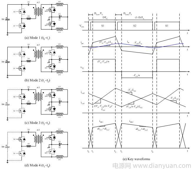 如圖 2 所示,從供電模式 2 開始,由于 S1 開啟,Vin-VCb 施加到變壓器的初級(jí)端,勵(lì)磁電流 im 以斜率 (Vin-VCb)/Lm.增加,由于 SR2 關(guān)斷,LO1 的電流斜率就由 (Vin-VCb)/n 減去輸出電壓決定。另一方面,LO2 的電流以斜率 –VO/LO2減小,這是流經(jīng) SR1 的續(xù)流 (free-wheeling)。當(dāng)兩個(gè)輸出電感分享負(fù)載電流時(shí),SR1 承擔(dān)全部負(fù)載電流。變壓器的次級(jí)繞組僅處理 iLO1 ,因而 iLO1/n 是反射到變壓器初級(jí)端的電流,它在勵(lì)磁電流上疊加,構(gòu)成初級(jí)電流 ipri。在實(shí)際上,由于漏電感的現(xiàn)象,所以 vT2 較圖 2 所示的數(shù)值稍低,但我們?cè)谶@一章段中將忽略這一情況,從而簡化分析。