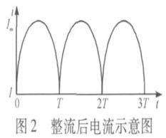 在開關電源中, 工頻交流電流經過整流橋后, 不再是單一頻率點的交流電流, 而是單向的脈動直流電流,其波形如圖2所示, 利用傅里葉變換可得: