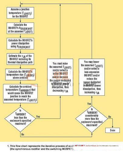 這一過程從首先假設各MOSFET的結溫開始,同樣的過程對于每個MOSFET單獨進行。MOSFET的功率耗散和允許的環境溫度都要計算。