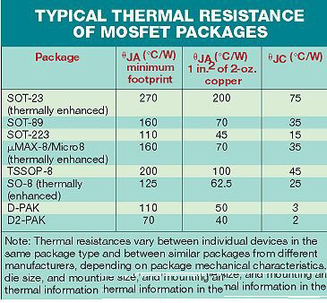 例如,采用1平方英寸的銅片,D-Pak的ΘJAD-Pak可能是50°C/W。但如果銅片就設在封裝引腳下,ΘJA值將會加倍(參見表)。采用多個并聯MOSFET,ΘJA主要依賴于它所安裝的銅片面積。兩個元器件的等效ΘJA可能是只有一個元器件時的一半,除非銅片的面積加倍。就是說,增加并聯MOSFET而不同時增加銅片面積,將使RDS(ON)減半,但對ΘJA的改變小得多。