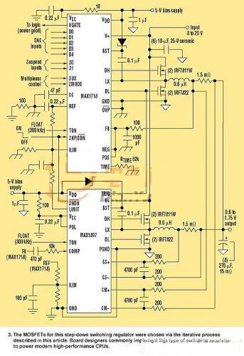 圖3所示CPU內核電源在40A提供1.3V。兩個同樣的20A電源在300kHz運行,提供40A輸出電源。MAX1718主控制器驅動一個,而MAX1897從控制器驅動另一個。該電源輸入范圍在8~20V之間,指定封裝的最高工組作環境溫度60°C。
