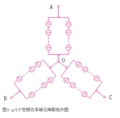1/2全電壓等級如圖3所示,由n/2個變頻功率單元串聯(lián)組成1個變流鏈,每相由2個變流鏈相并聯(lián),實現(xiàn)1/2全電壓等級的三相交流恒功率輸出,其中n為偶數(shù)。