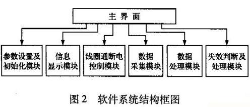 本系統(tǒng)應(yīng)用軟件由6個(gè)功能模塊組成:參數(shù)設(shè)置及初始化模塊、信息顯示模塊、線圈通斷電控制模塊、數(shù)據(jù)采集模塊、數(shù)據(jù)處理模塊、失效判定及處理模塊,其結(jié)構(gòu)框圖如圖2所示。
