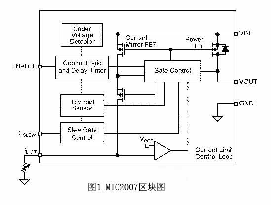 圖1展示了MicrEL公司MIC2007型限流配電開(kāi)關(guān)圖例。