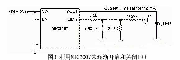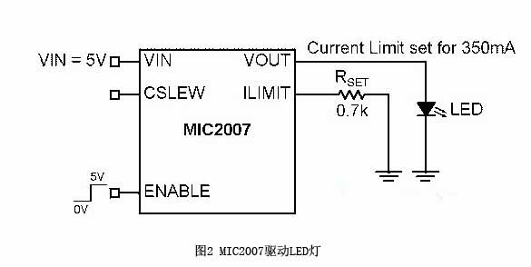 圖2展示的是輸出和LED相連的配電開(kāi)關(guān)。MIC2007可以在2.5V-5.5V的輸入電壓下工作。它是通過(guò)外置電阻器Rset來(lái)設(shè)定限流值的。限流值等于CLF/Rset,CLF為限流因數(shù),一般是245(請(qǐng)參考MIC2007數(shù)據(jù)表暨電氣性能表),而Rset 則等于0.7 kΩ。因此,限流值就是245/0.7 kΩ = 350 mA。