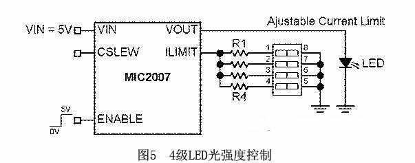 MIC2007可以在開(kāi)關(guān)開(kāi)啟且LED已點(diǎn)亮之后調(diào)節(jié)限流值。而通過(guò)改變限流值,就可以動(dòng)態(tài)調(diào)節(jié)LED的光強(qiáng)度。如圖5所示,有4個(gè)電阻器連接到Ilimit管腳。