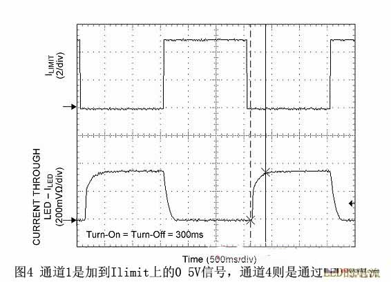 圖4中通道1是加到Ilimit上的0 5 V信號(hào),而通道4則是通過(guò)LED的電流(Iled; 開(kāi)啟時(shí)間= 關(guān)閉時(shí)間= 300 ms)。