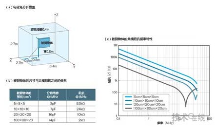 利用尺寸各異的4種對象物進行了電磁場解析模擬,計算出了從人工電源網絡觀察被測物體時的共模阻抗(a)。根據結果可知,形狀越大,屏蔽室基準面與被測物體的分布電容越大,共模路徑的阻抗就越低(b)。另外,頻率越高,共模阻抗越低(c)。