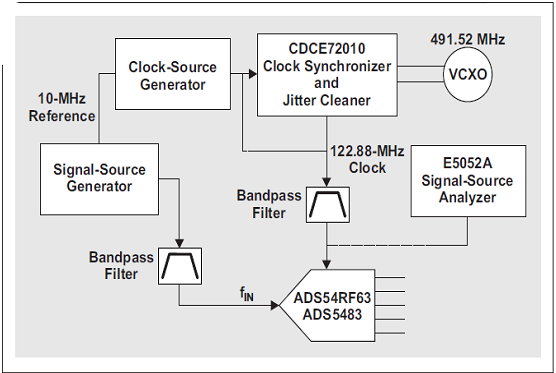 為了證明未濾波時鐘信號的相位噪聲需要積分至約兩倍采樣頻率,我們實施了如下試驗:在 CDCE72010 輸出和 ADS54RF63 時鐘輸入之間添加不同的低通濾波器。