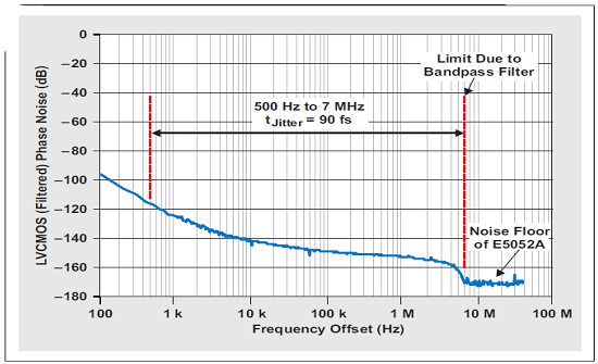圖 12 所示曲線圖描述了濾波后 CDCE72010 LVCMOS 輸出的測得輸出相位噪聲。131000 點的 FFT 大小將低積分帶寬設定為 ~500 Hz。積分上限由帶通濾波器設定,其影響在相位噪聲曲線圖中清晰可見。超出曲線圖所示帶通濾波器限制的相位噪聲為 E5052A 的噪聲底限,不應包括在抖動計算中。濾波后相位噪聲輸出的積分帶來 ~90 fs 的時鐘抖動。