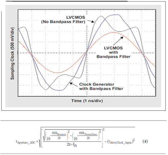 不匹配的原因是,計算得出的孔徑抖動是基于時鐘源生成器的快速轉換速率。CDCE72010 的 LVCMOS 輸出消除了時鐘信號的高階諧波,其有助于形成快速升降沿。圖 13 所示波形圖表明了帶通濾波器急劇降低未濾波 LVCMOS 輸出轉換速率,以及將方波轉換為正弦波的過程。