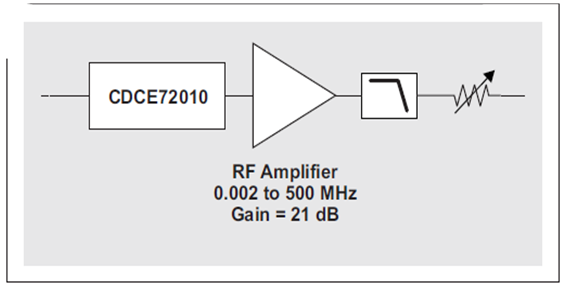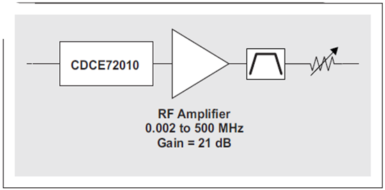 改善轉換速率的一種方法是:在 CDCE72010 的 LVCMOS 輸出和帶通濾波器之間添加一個具有相當量增益的低噪聲 RF 放大器,參見圖 14。該放大器應該放置于濾波器前面,這樣便可以將其對時鐘信號的噪聲影響程度限定在濾波器帶寬,而非 ADC 的時鐘輸入帶寬。由于下一個試驗的放大器具有 21 dB 的增益,因此我們在帶通濾波器后面增加了一個可變衰減器,旨在匹配濾波后 LVCMOS 信號到時鐘生成器濾波后輸出的轉換速率。該衰減器可防止 ADC 的時鐘輸入超出最大額定值。