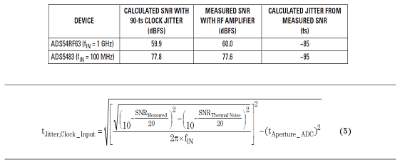 通過在時鐘輸入通路中安裝低噪聲 RF 放大器,兩個數據轉換器重復進行了高輸入頻率的 SNR 測量,其結果如表 5 所示。我們可以看到,測得 SNR 和預計 SNR 匹配的非常好。使用下面的方程式 5,計算得到的時鐘抖動值在 90-fs 時鐘抖動的 5 fs 以內,其結果通過相位噪聲測得推導得出。
