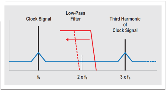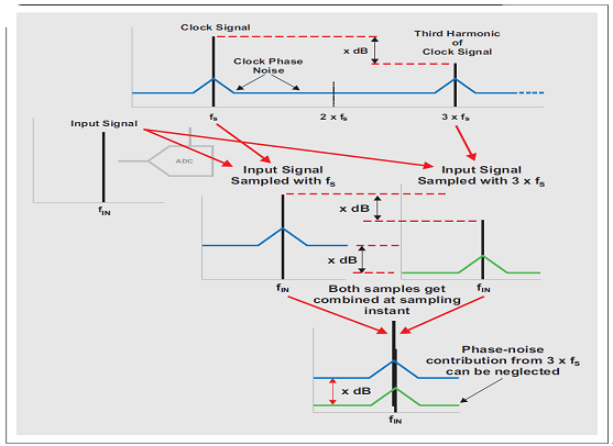 在采樣時間,基頻正弦波及高階諧波與輸入信號混頻,如圖 16 所示。(為了簡單起見,僅顯示了一個諧波。)因此,三階諧波周圍的相位噪聲與輸入信號混頻,而第三諧波也形成一個混頻結果。但是,由于時鐘信號的第三諧波的振幅更低,因此該混頻結果的振幅也被降低。